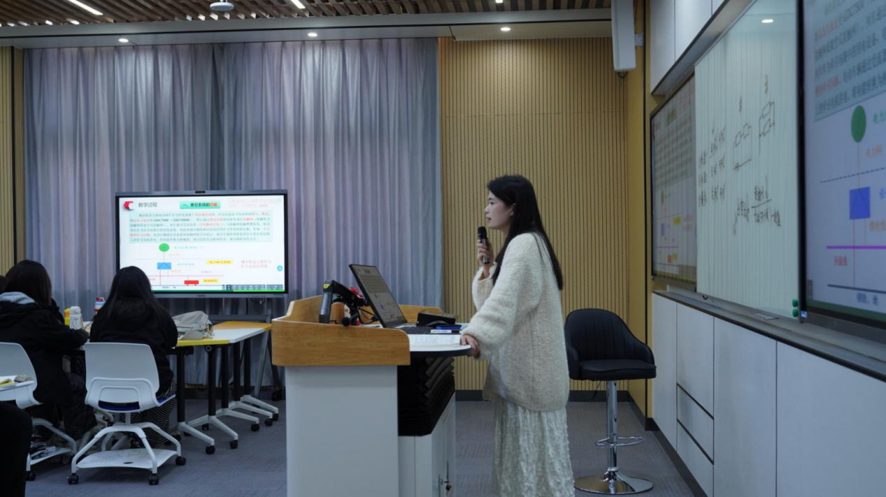 为增强课堂互动性与学生参与感,教室还配置了6台65寸小组研讨一体机与可灵活拼接的课座椅。学生可通过手机、电脑等设备将观点实时投屏,开展小组“头脑风暴”,并可随时将研讨成果分享至教师端或其他小组进行展示等功能。灵活的座椅布局进一步支持多种教学模式,助力课堂从“以教为主”向“以学为主”转变。